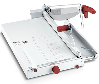 Resharpenable, high-quality blade set made of ”Solingen steel” | solid manual clamp for variable pressure | precision side lay with measuring scale (mm/inches) and adjustable backgauge | lockable front gauge with integrated narrow strip cutting device for cutting of strips as small as one mm | the front gauge is adjustable via a calibrated rotary knob | fold-away paper supports on front gauge | standard paper sizes indicated on the table | automatic safety guard made from transparent, unbreakable plastic material (guard rises and falls with the movement of the blade) | solid cast aluminium blade mounting bracket with double pivot bearings for blade axle | solid all-metal construction Table size (WxD): 356 x 604 mm Dimensions (HxWxD): 260 x 410 x 790 mm Weight: 14 kg